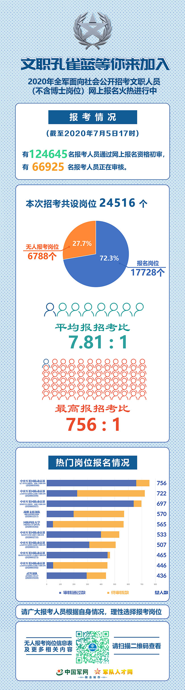 2020年全军面向社会公开招考文职人员(不含博士岗位)网上报名火热进行中,截至2020年7月5日17时,有124645名报考人员通过网上报名资格初审,66925名报考人员正在审核。17728个岗位有考生报考、占72.3%,平均报招考比为7.8∶1,最高报招考比为756∶1,有6788个岗位暂时无人报考,请广大报考人员根据自身情况,理性选择报考岗位。相关岗位报考情况如下: