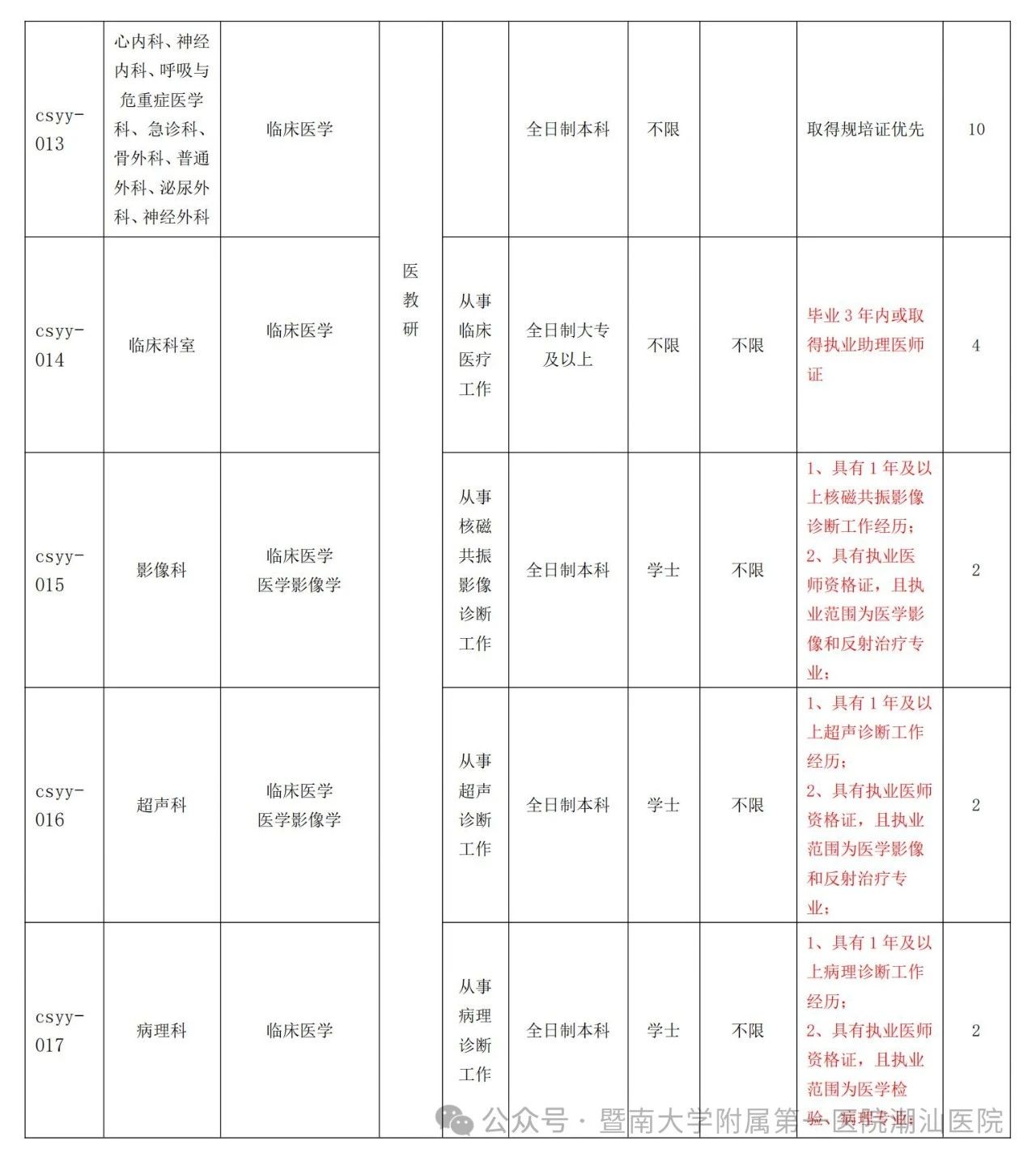 地点:暨南大学附属第一医院潮汕医院(饶平县黄冈镇环城北路969号)行政楼三楼人事科。